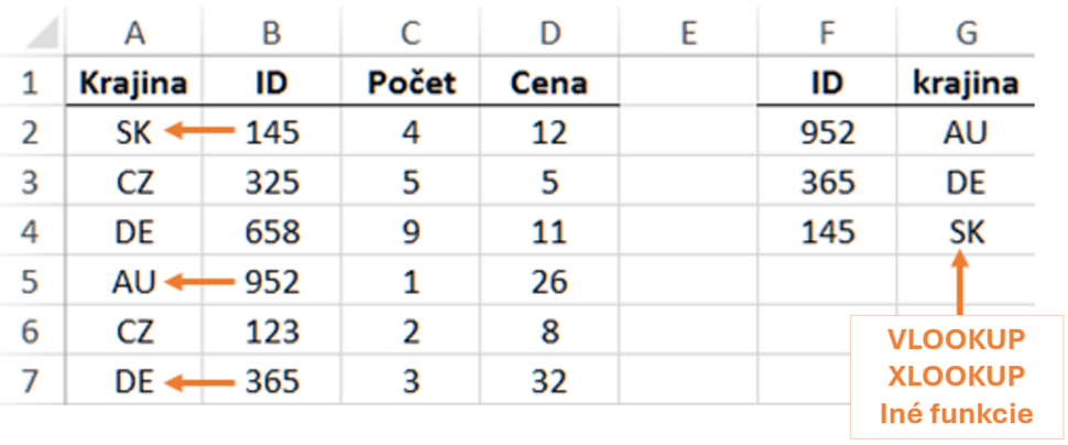 Avšak v ľavej tabuľke je ID v stĺpci B a Krajina v A, čo bežný VLOOKUP nezvládne.