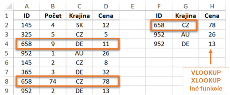 Bežný VLOOKUP v stĺpci A nájde prvý výskyt ID 658 a hurá, má výsledok. Avšak nájde krajinu DE, ale my potrebujeme CZ.