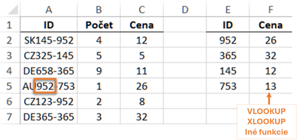 ✅ Efektívne riešenie: Vyrieši to VLOOKUP alebo XLOOKUP (prípadne aj iné vyhľadávacie funkcie) = všetky dokážu hľadať iba časť bunky.