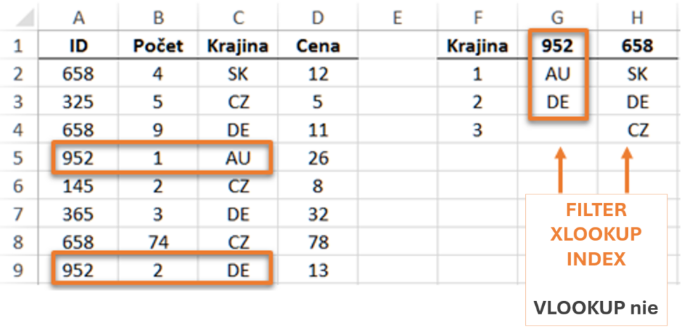 Ukážka: V príklade potrebujeme do stĺpca G doplniť všetky Krajiny s ID 952. V ľavej tabuľke sa vyskytuje dvakrát = sú to krajiny AU a DE.