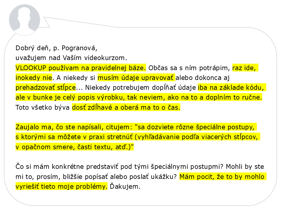Nezabudnite, prosím, napísať, že sa pýtate ku kurzu VLOOKUP. Aby nedošlo k nedorozumeniu, keďže kurzov mám v ponuke viac.