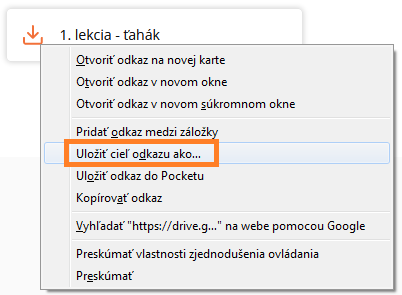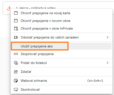- kliknite na tlačidlo pravým tlačidlom myši a zvoľte voľbu "Uložiť prepojenie ako". Môže sa to volať aj inak (podľa prehliadača), napr. "Uložiť cieľ odkazu ako" a podobne,